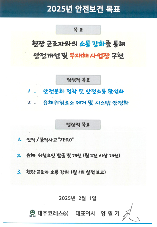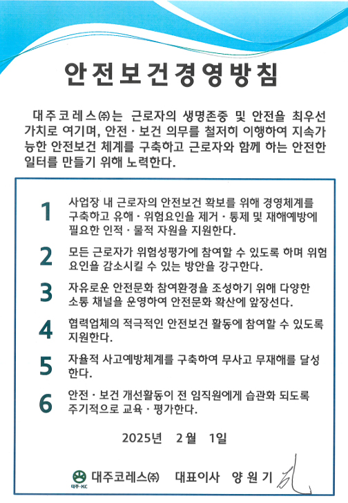 대주코레스는 ISO 45001 국제표준 인증 취득, 운영을 통하여 국내외 규제에 선제적으로 대응함과 동시에 환경적인 회사를 만들기 위하여 전 임직원을 대상으로 맞춤형 교육을 실시하고 있습니다.